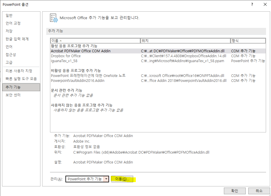 ppt 열고 파일 -> 옵션 -> 추가기능 -> 새로설치