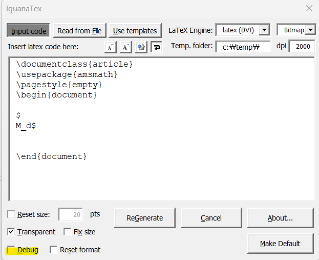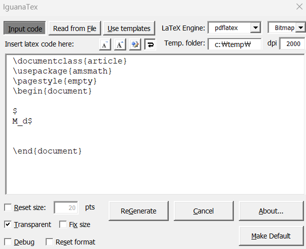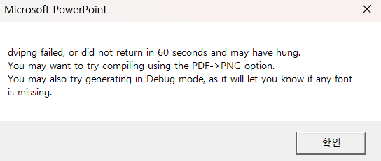 *아래와 같은 오류 뜰 경우, IguanaTex에서 Debug 체크하고 시작하면 필요한거 알아서 debug 해줌.